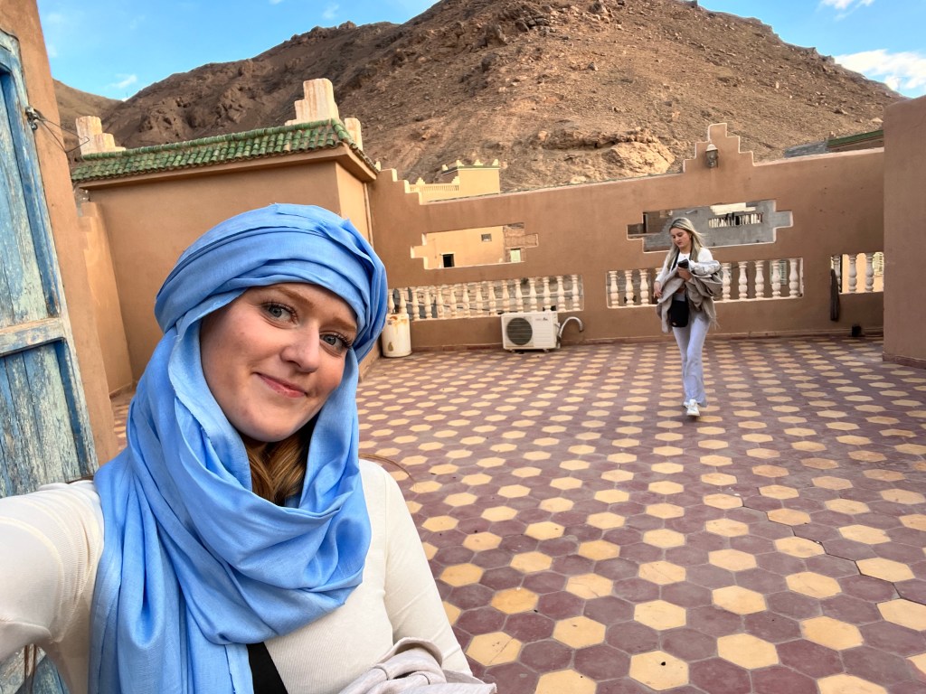 We finally made it to Zagora right before the sunset and stopped to get head scarves for the camel ride. The men selling the scarves were so kind and taught us how to put the head scarves on correctly. We all picked out colors, tried a bunch on, and took pictures before we headed to the desert.