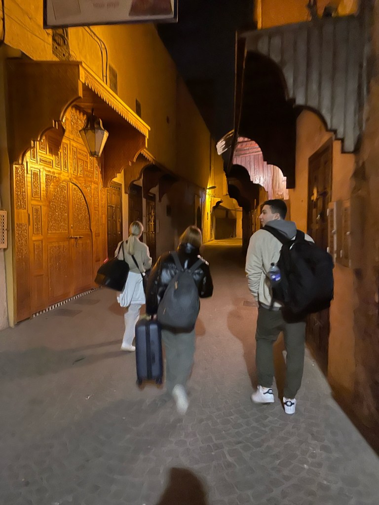 We started the trip off on a Thursday night, where we flew from Barcelona to Madrid, and Madrid to Marrakech. The flight wasn’t bad at all – considering I was flying into a different continent, it was a relatively short journey. Our trip started off a little rocky. We landed in Marrakech at around 2 in the morning, and we had no idea how to get to our hostel because we were so used to calling Uber’s, Cabify, and other driving apps, and there were no taxi lines so we felt a little lost. As a group, we continued to walk out of the airport and follow the rest of the crowd that was on our flight. We stopped at a parking lot where there were dozens of men asking if we wanted taxis and rides. This was a little overwhelming because there were so many cars and people but none of their cars had taxi symbols on them or any proof that they were actually going to take us to our destination so we did not know who to trust. This was nerve racking because we had just arrived and knew nothing about the country and if this was safe or not. We ended up biting the bullet and just getting into a car with one of the men who said he would bring us to our hostel. We showed him the address of our hostel and he started driving. I put the destination in my phone maps to be sure we were going the right way. Around 12 minutes into the drive, the driver stops in a random alley and tells us to get out of the car. Since there was a language barrier, us not knowing French or Arabic, and him barely speaking English, we had no idea why he was telling us to get out of the car. At this point, although I was probably being dramatic, I started to freak out. We all tried to describe to him that we were not at our destination, and that he needed to continue driving. He continued to tell us to get out and that he could not drive us there. It was dark, and it was now around 3 in the morning at this point. We had no idea where we were, there were no street lights, and all the signs around us were in Arabic. After google translating to him, saying that we weren’t comfortable getting out of the car, he finally started to understand what we were trying to say. He drove a little further until he typed on google translate that he was unable to drive down to our hostel because of the road being closed. This made a lot more sense and we started to feel a little safer at this point. Luckily, the driver decided to park his car and walk us to our hostel to make us feel more comfortable. We arrived at the hostel, checked in, and went straight to bed.