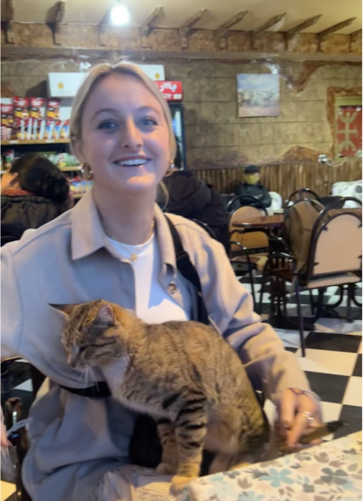 Once we got on the bus and started driving, I felt so much better. I felt completely safe and began to get so excited to start our journey to Zagora. Around 1 hour into the drive, we stopped at a small place in a tiny village for breakfast. We got pieces of bread, mint tea, and other sweet breakfast pastries to eat. There were cats roaming around the cafe that jumped up on our laps and wanted to be pet. We spent around 20 minutes here, enjoying our food, trying mint tea, petting the cats, and walking around the area. It was still early in the morning so it was freezing cold and a little rainy.